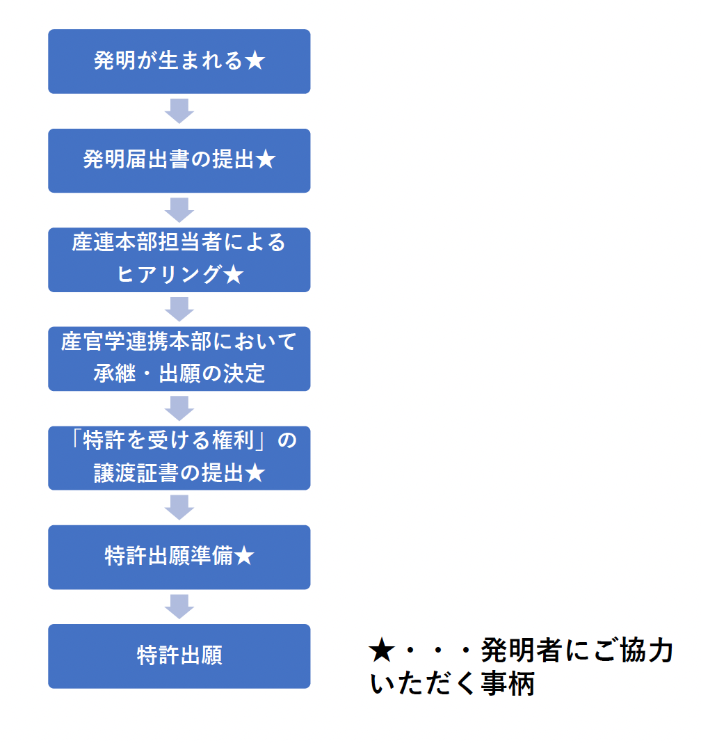 | 発明届提出後の流れを教えてください。 | ①発明届の提出を受けて、発明者に対して技術移転担当者がヒアリングを行います。 ②ヒアリングの内容をもとに特許や学術文献の先行技術に関する追加調査や市場性の調査などを行います。なお、ヒアリングの結果、発明者に対してデータの追加や改良についてご相談することがあります。 ③産官学連携本部において、当該発明に係る権利を大学として承継し出願するかどうか決定します。 ④大学が承継・出願を決定した場合、発明者には「特許を受ける権利」を大学に対して譲渡する証書に署名いただきます。 ⑤発明者の方には特許出願の準備(明細書作成など)、特許庁からの審査への対応にご協力いただきます。 |